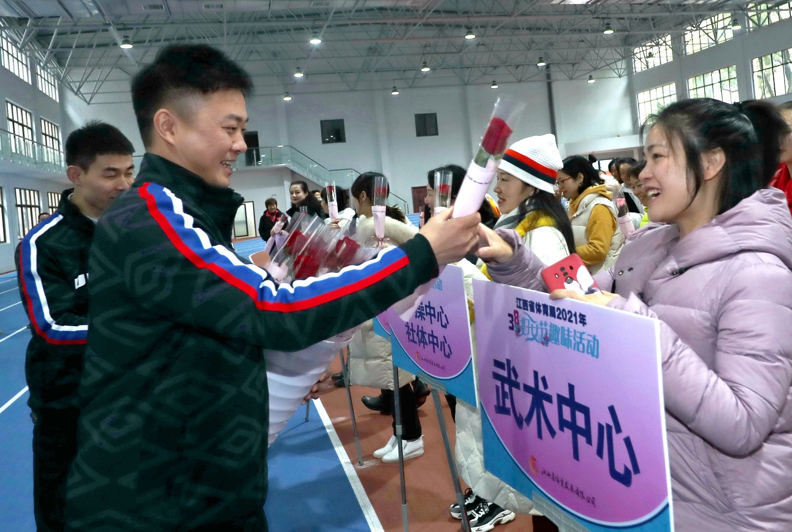 趣味賽特設(shè)暖男獻(xiàn)花環(huán)節(jié),為每一位參賽者送上鮮花,感謝她們一年來辛勤付出,為江西體育事業(yè)發(fā)展做出了積極貢獻(xiàn)。本次三八節(jié)趣味賽拓寬了省體育系統(tǒng)女干部職工的業(yè)余文化生活,團(tuán)結(jié)引領(lǐng)廣大女干部職工立足崗位、爭(zhēng)創(chuàng)一流,以更加飽滿的熱情參與江西體育事業(yè)大發(fā)展。