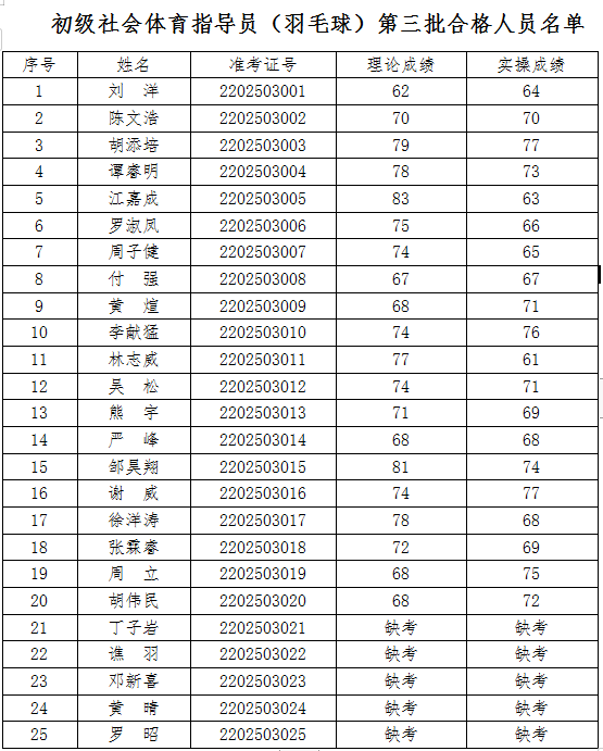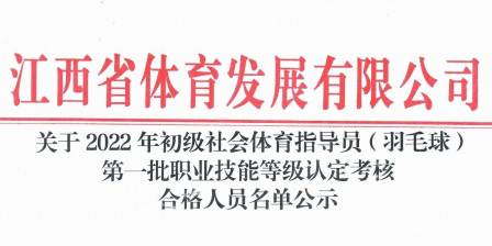 關(guān)于2022年初級(jí)社會(huì)體育指導(dǎo)員(羽毛球)第三批職業(yè)技能等級(jí)認(rèn)定考核合格人員名單公示 根據(jù)《江西省人力資源和社會(huì)保障廳關(guān)于公布江西省第...
