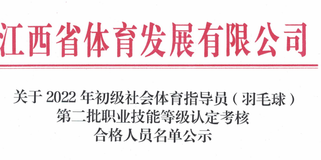 關(guān)于2022年初級(jí)社會(huì)體育指導(dǎo)員(羽毛球)第三批職業(yè)技能等級(jí)認(rèn)定考核合格人員名單公示 根據(jù)《江西省人力資源和社會(huì)保障廳關(guān)于公布江西省第...